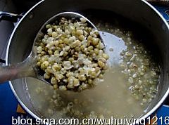 锅中添满水将泡发的绿豆倒入锅中,加人冰糖,大火煮10分钟转文火煮20分钟。直到绿豆煮烂开花为之。