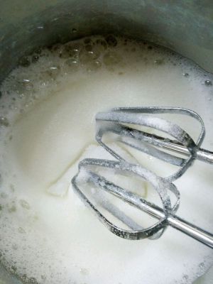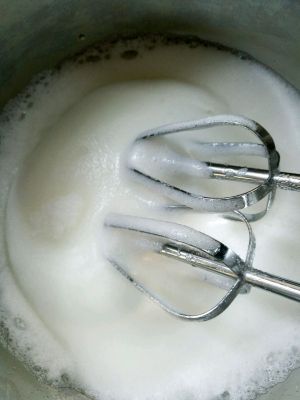 3.蛋白打发至细泡状态,加入10克细砂糖,继续打发。