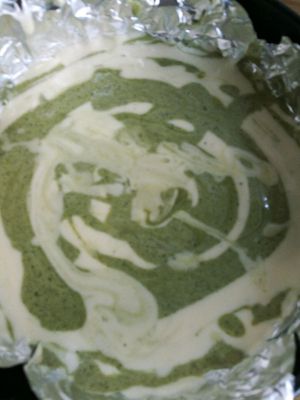 12.将面糊分成两份,取其中一份,放抹茶粉由上至下快速翻拌均匀。