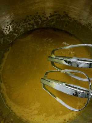 6.蛋黄里加入20克细砂糖,用蛋打器打发至细砂糖融化