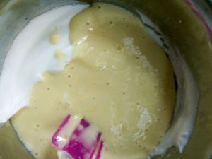 7.一边搅拌一边加入色拉油,彻底拌均匀。