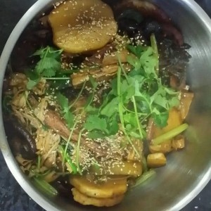大红袍块儿融化,锅里出红油后,放五花肉,腊肉炒到五花肉变金黄色,放香菇,木耳炒