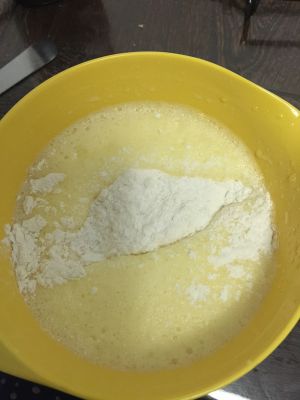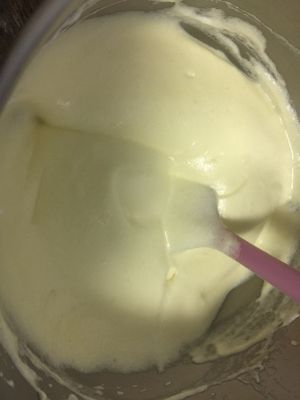 取出蛋清,3分1加入蛋黄糊,切拌均匀后倒入蛋清切拌均匀。同时180°预热烤箱。
