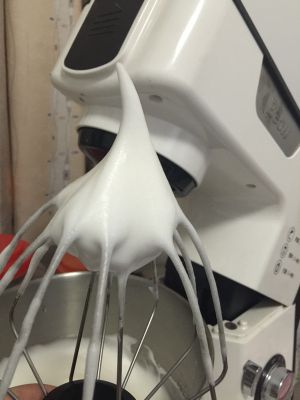 蛋清分离,分次加入30g糖,打至大弯勾状态,放入冰箱冷藏。