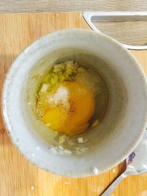 在容器内加入葱白末、鸡蛋、盐、白胡椒粉。