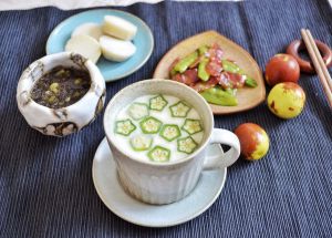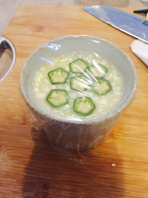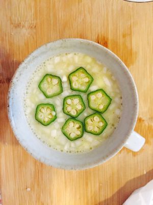 搅拌均匀后加入凉白开,再搅均后放入秋葵。
