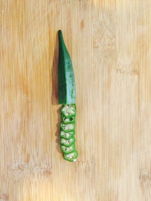 因为秋葵表面是毛茸茸的,所以需要用盐水泡十分钟洗净,然后切薄片。