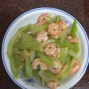 再倒油烧热,放西芹炒熟再倒入虾仁,下盐翻炒盛盘