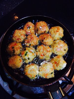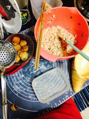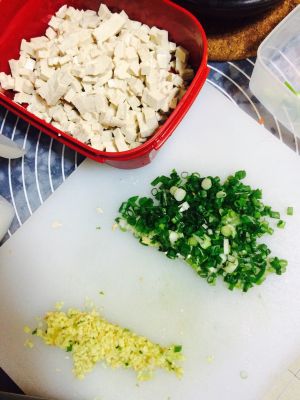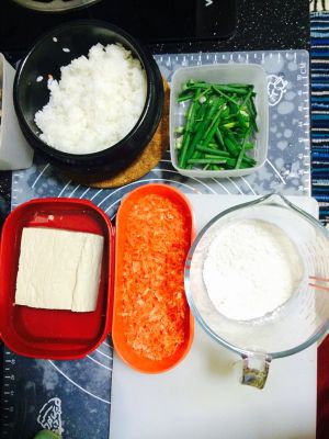 准备材料,剩米饭,面粉,豆腐,胡萝卜丝,葱花