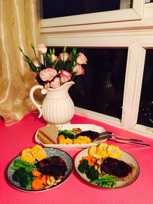 接下来是煎牛排,忘记拍照了(T ^ T),将橄榄油(用黄油更香哦)放入锅中,热了之后,将牛排放入,等煎到变色翻另一面,煎到变色,盛出装盘,将蘑菇放到煎牛排的锅中煎烤,等蘑菇变软就可以乘出装盘,然后将锅子洗净,倒入些许的橄榄油,煸炒洋葱,出了香味后,将黑椒酱倒入锅中,翻炒,倒入红酒,煮30s,关火等待装盘
