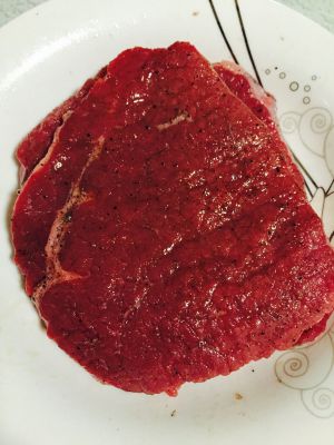 先讲牛肉洗干净,用厨房用纸将牛肉表面的水分吸干,用刀背拍打牛肉(记得两面都要拍打哦^_^),然后在牛肉上撒上食盐,将两面抹均匀,再撒上椒盐,将两面抹均匀,再撒上黑椒粉,将两面抹均匀,最后倒上橄榄油,还是要两面抹均匀,腌制,准备其他配料