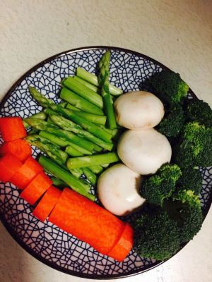 玉米切成1cm左右的圆柱,切的时候将锅中倒入水,煮开后先讲玉米放入锅中,煮6mins,捞出玉米,放入一小勺食盐(食盐可以使食物的颜色更加鲜艳,也增加水煮菜的口味),将芦笋,胡萝卜,西兰花放入水中煮3mins,捞出