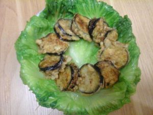 茄子加上肉馅后沾上面糊在油锅里炸熟即可
