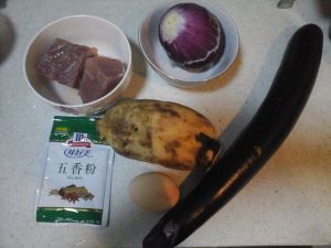 准备食材茄子,五香粉,洋葱,鸡蛋,猪肉,面粉,淀粉,生菜