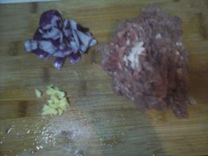将猪肉,洋葱,姜一起切成末,再加上五香粉,盐,鸡精,酱油一起混合成肉陷