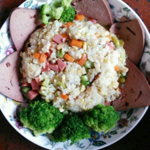 将香菇、胡萝卜、西兰花梗洗净切丁,西兰花的花部留着装饰(也是可以吃的)。将食材在沸水里滚一下,注意滚的时候放几滴油和少量盐。滚完后要沥干水份,一会还要炒。