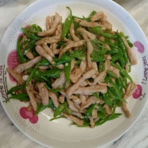 没照清楚……将油烧熟 冷却至6成熟左右 放入姜丝和花椒煸香 再下肉丝 油不烫时更容易将肉丝和开哦