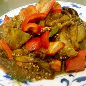 锅里重新放油(一点点就够)放入葱花炒香,然后倒入煎好的茄子,翻炒两下放入调好的红烧汁