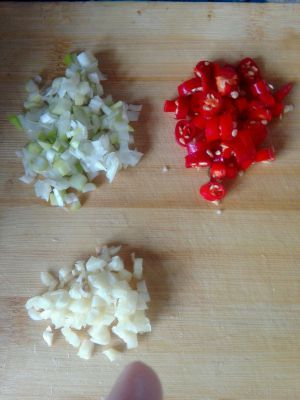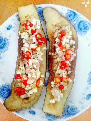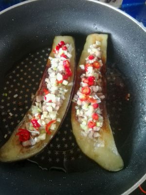 茄子有肉的一面煎好以后,翻过来煎有皮那面,可少倒入一点酱油在茄子上。然后在挖出的空隙里依次塞上肉末,蒜末,葱花和红辣椒,再撒上一点点孜然粉调味。煎至茄子软嫩并有香味飘出。