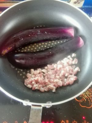 用饼铛(炒勺也行,到饼铛不容易糊)倒入油烧热,将茄子有肉的一面先煎熟。同时在旁边空隙放入肉末煎熟(很快就熟了),将肉末盛出备用。