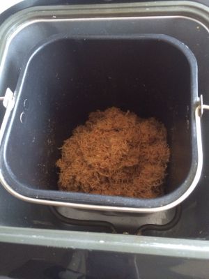 把撕碎的瘦肉丝,放到面包机里,然后放一勺半糖,一勺老抽,两勺生抽,一勺油,我放的是绿茶油,也可以放别的油,搅拌均匀后,启动果酱功能,剩下的时间就是耐心等待了,我的面包机没有肉松功能,所以用的果酱功能