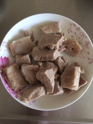 猪瘦肉切小块,和花椒,大料,桂皮,盐一起煮烂,我用的是高压锅,上气后中小火20至25分钟,关火自然放气后捞出放凉