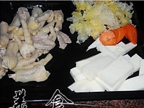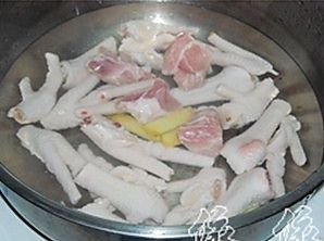 鸡脚剁去指甲,斩成两段,瘦肉切件,放进冷水锅中,加入姜片和几滴白酒,煮开后捞出冲洗干净血沫。