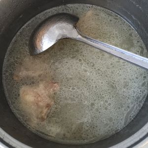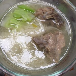 大骨凉水下锅,倒入料酒,煮沸~捞出后放入新锅,倒入热水,放入葱,姜,八角,煮好后放入盐,汤要稍咸一点,不然面会淡。