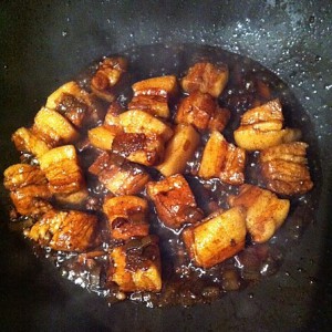 洗净de炒锅放入两汤匙清水,水开后放白糖(我放了3铁勺),当白糖变成气泡的时候,放出炒过的猪肉,翻炒2min,倒入老抽料酒,继续翻炒