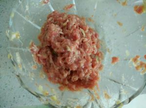 肉馅加入葱花,精盐,鸡精,耗油,食用油,水,和淀粉。