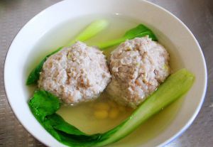锅里放足量水烧开后轻轻放入成团的狮子头,再放入葱段姜片,黄豆小火炖30分钟,出锅啦!