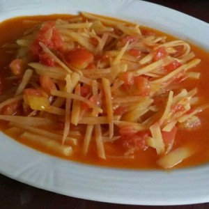 土豆切丝放入水里泡2-3分钟,番茄切块