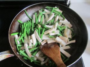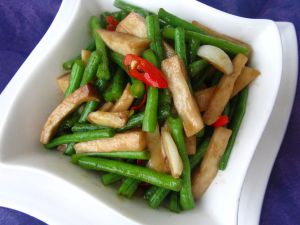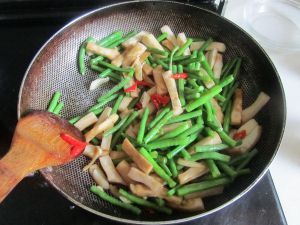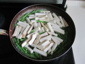 煸炒香后下入焯过水的豆角和杏鲍菇翻炒;