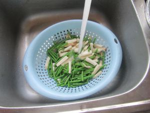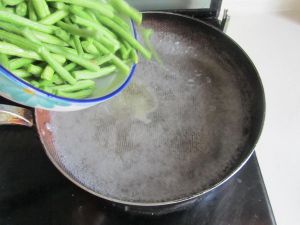烧锅开水, 加入少量的盐和油, 先下入豆角煮一下;