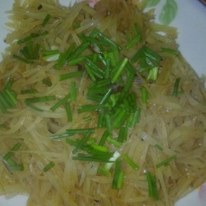 中间过程都忘记拍了。锅放油烧热,花椒下锅过一下,把花椒捞出来(注意油温不要太高哦!)放入少许蒜头,翻炒一下倒入土豆丝再翻炒,加入鸡精,盐,糖,再翻炒。加少许醋,迅速翻炒下,装盘撒葱花。