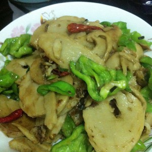 加入面筋后不断翻炒(以防面筋粘锅),这时不需太大的火候(比平时少小一点,我 用的电池炉相对小一个火),待其微黄可在翻炒两下加入酱油和青椒(本人比较喜欢嫩一点,可根据个口味多炒一段时间至其金黄),然后翻炒一至两分钟加入盐、味精翻炒均匀即可