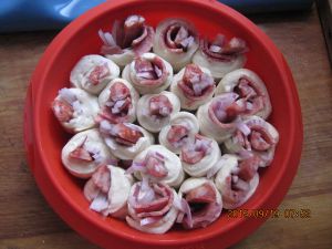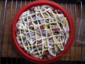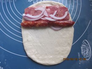 面团擀开与香肠和半根培根同长的宽度。摆上辅料,如图。