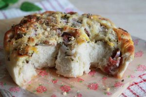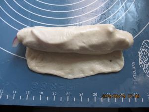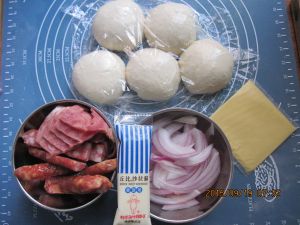 先将主材料中除黄油外混合,揉至光滑,加入黄油揉至能拉出薄膜(不必太刻意,尽量多揉即可,不必像土司那样手套膜)。发至二倍大后分成5份松弛。准备其他的材料。