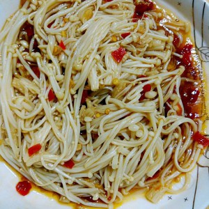 金针菇切头冲洗干净后装入盘中,隔水大火蒸5分钟