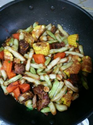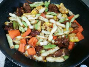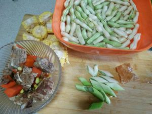 第二种,红烧排骨豆角做法。前面一样炖40分钟的时候可以捞出来待用,食材:豆角,玉米,老冰糖,大葱,因为是晚上我就没放姜了!!