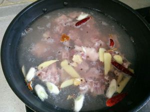 砂锅水开后(凉水会使肉变紧)放入排骨,西红柿!!小火一小时