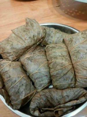 摊平荷叶,先铺一层蒸至半熟的糯米,放入鸡肉,香菇等,再铺上一层糯米包好放一边待蒸。