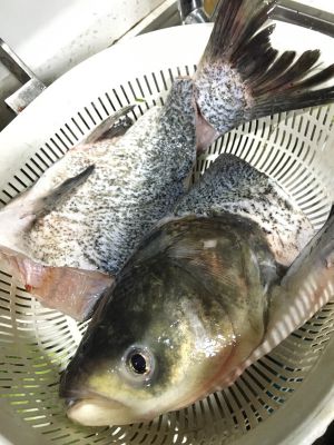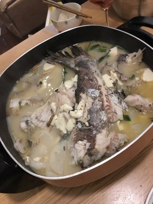 下鱼头,煎黄,撒上料酒适量,下滚水没过鱼头。