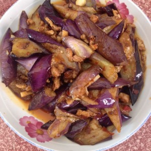 茄子炸起来,沥干备用,油留一些,瘦肉下去炒下,放入豆瓣酱,翻炒