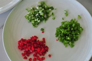 小葱洗净切碎段,红绿辣椒切细丁,同时大蒜头拍扁切细末,取少许生姜切细粒待用。