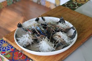 将提前煮软的粉丝切小段,一撮一撮轻放在已经摆好的罗氏沼虾上。