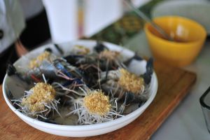 然后将提前调好的蒜茸汁浇在粉丝上面,让汁液透过粉丝流到虾肉上。
