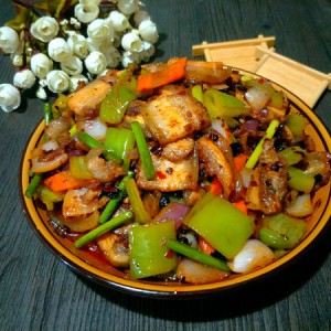 锅中留油,油热加入豆瓣酱快速炒出红油,加入青蒜,青椒,胡萝卜,洋葱翻炒至八成熟,加入五花肉继续翻炒
