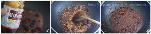 锅下油爆香红椒粒,然后倒入拌饭酱和肉末翻炒,炒至水份收干,做成肉酱。