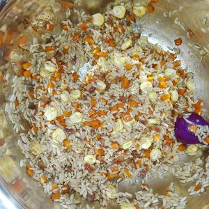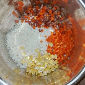 泡好的糯米沥干水分,胡萝卜、腊肠切成小丁,与玉米粒一起加到糯米中搅拌均匀。